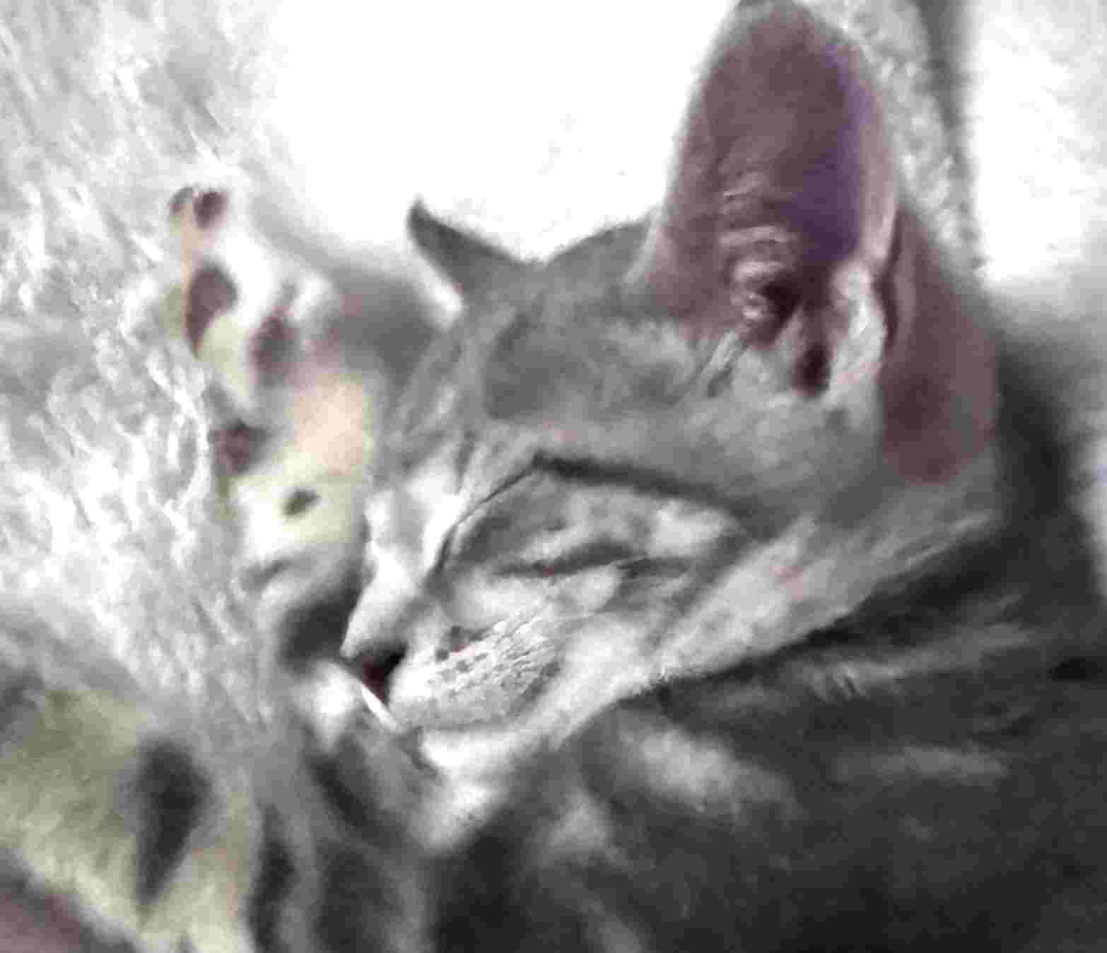 Description | Grayish brown tabby with yellowish eyes. Fairly large. Tolerates humans, but is VERY mean to other cats. | |||